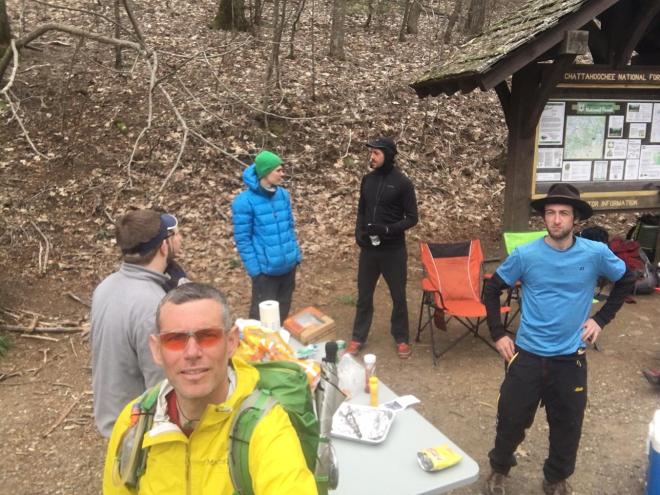 There was some Trail Magic set up right I the trailhead parking lot (soda, hot dogs, cookies, chips), plus some chairs to relax in. I chatted with a couple hikers I’d met who caught up to me (Zack to right of me and Chris and Florian in the back).