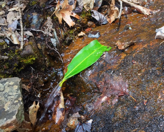 This is how you collect water from a trickle into your water bottle using a rhododendron leaf. It tasted great!