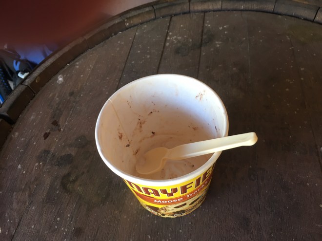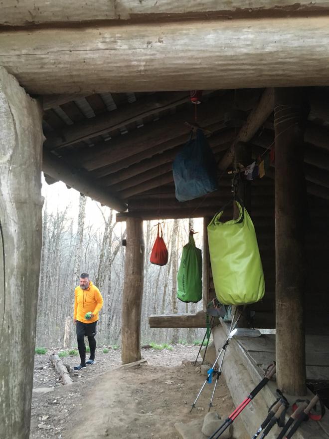 The answer to yesterday’s trivia question…the odd Blair Witch looking objects hanging from the rafters at the shelters are to hang your food from to protect from mice. The cans and bottles are strung above (hard to see in this pic…look at yesterday’s) to keep the mice from climbing right down the rope onto your food bag.