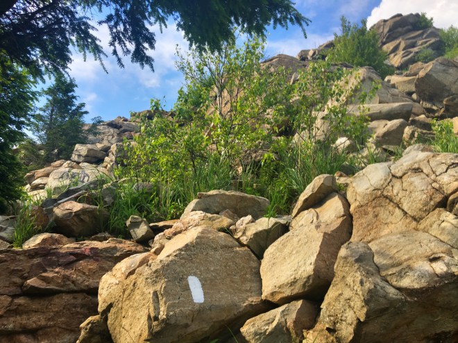 Those trail conditions deteriorated quickly…as the rock dancing began. The best comparison is that it’s a lot like skiing the bumps. You need to keep searching for a good line and bad things can happen when you lose your forward momentum. You’d be surprised at the size of boulder one can make teeter while walking across it.