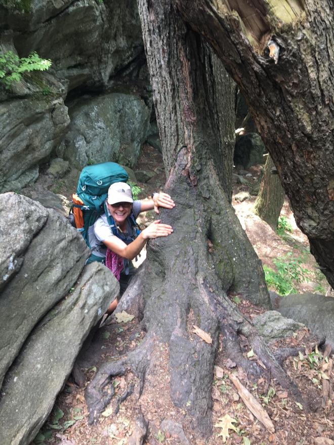 I hiked almost the whole day with B-Hiker, a soon to be 50yr old German woman now living in NJ. Here she is working hard to get up and over one of the many rock obstacles we faced today.