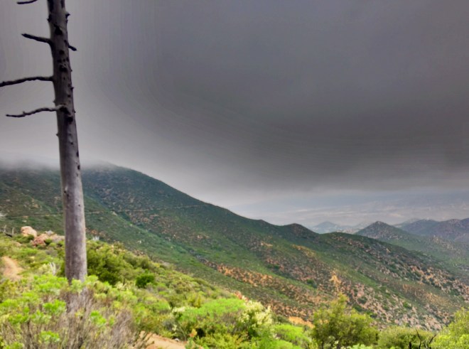 Later in the day the trail had gained about 3000′ and the clouds rolled in with temps in the 50’s. If you zoom in you can see Mike’s water tanks on the right side and his house toward the middle.