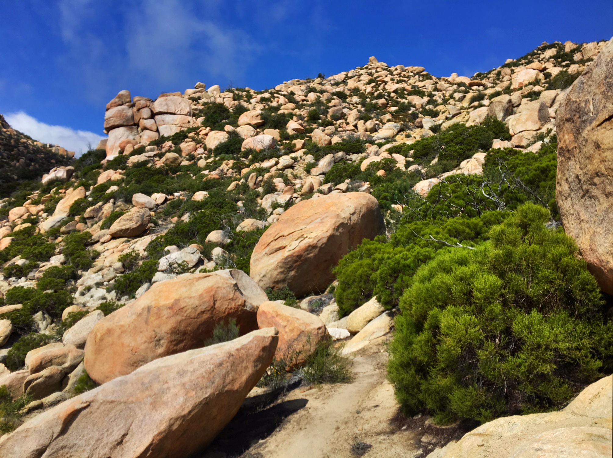 The trail passed through all sorts of terrain. From creeks with big trees to desert mountains with tons of cactus and agave (still trying to figure out how you squeeze the tequila out?). The area pictured below was an interesting (and random) boulder field.