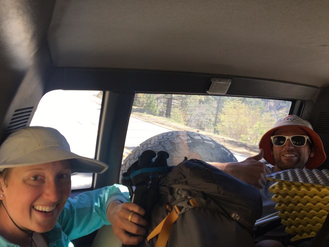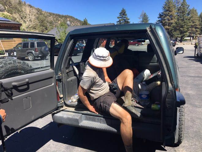 Crammed in the back of a truck while hitching into Wrightwood, CA.