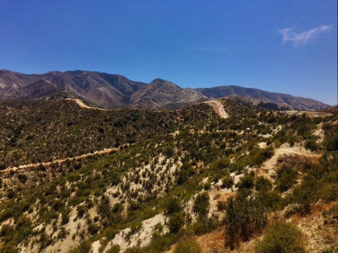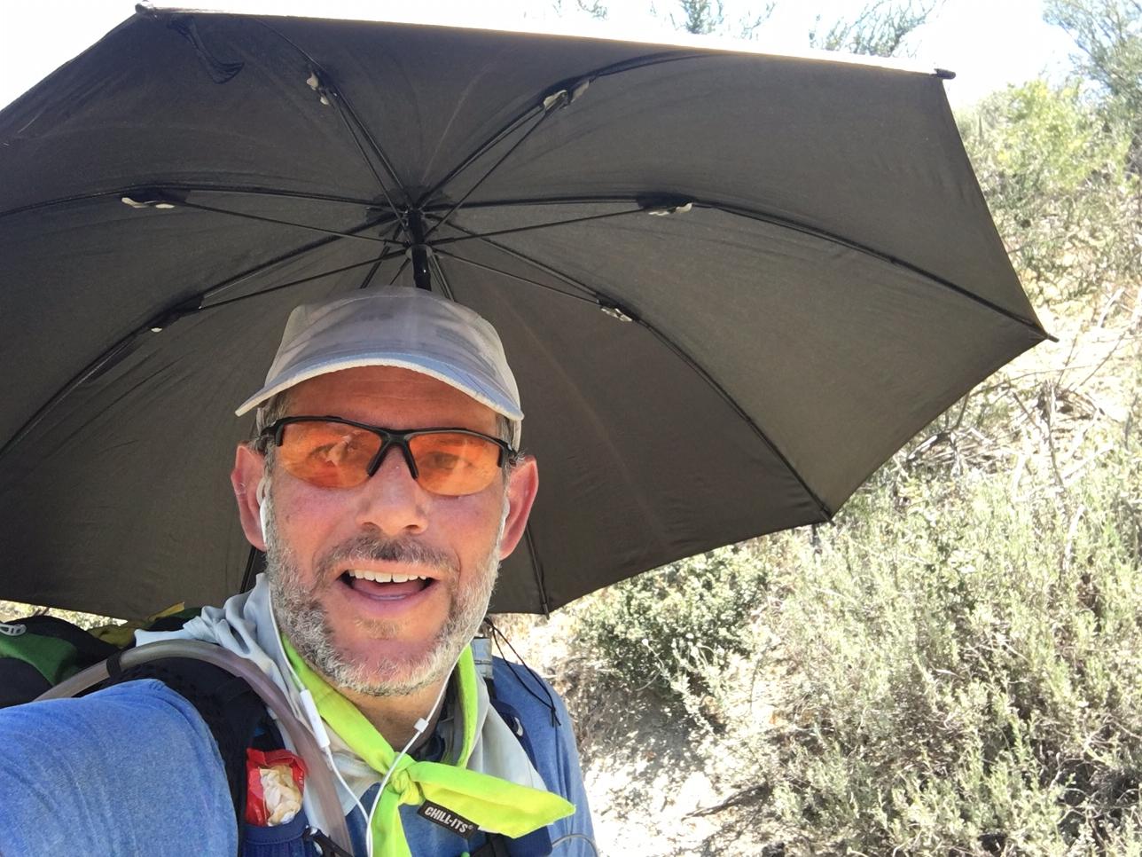 The next 8 miles was when it really started to heat up. There wasn’t a living thing over knee high where you could find shade (the whole area had burned several years ago). Luckily, my umbrella was there to the rescue. This is what I look like in 98 degree heat under the blazing sun. As they say, “you can’t spell suffering without an F-U-N”