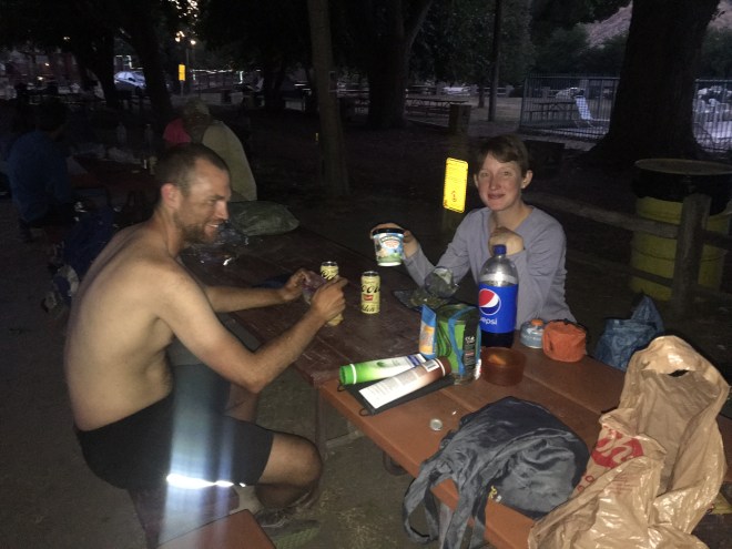 Around 7:00 look who rolled in…Locomotive and Bronco. They did a 30 mile day in the heat just for a cold soda and Ben and Jerrys.