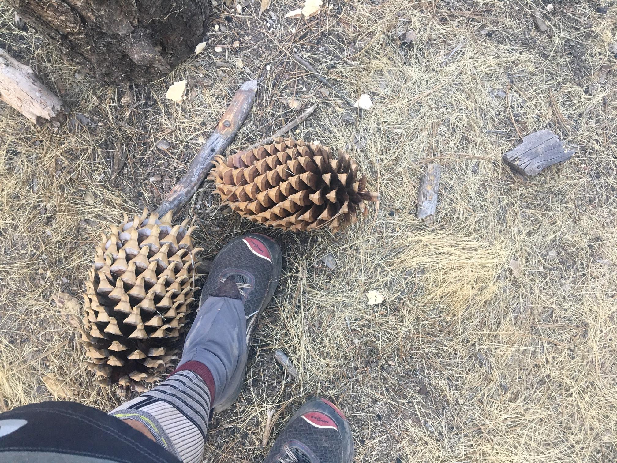 All the super-size pine cones are impressive. This variety (Colter Pine?) are not only huge but have huge sharp-pointy barbs at the end of each petal.
