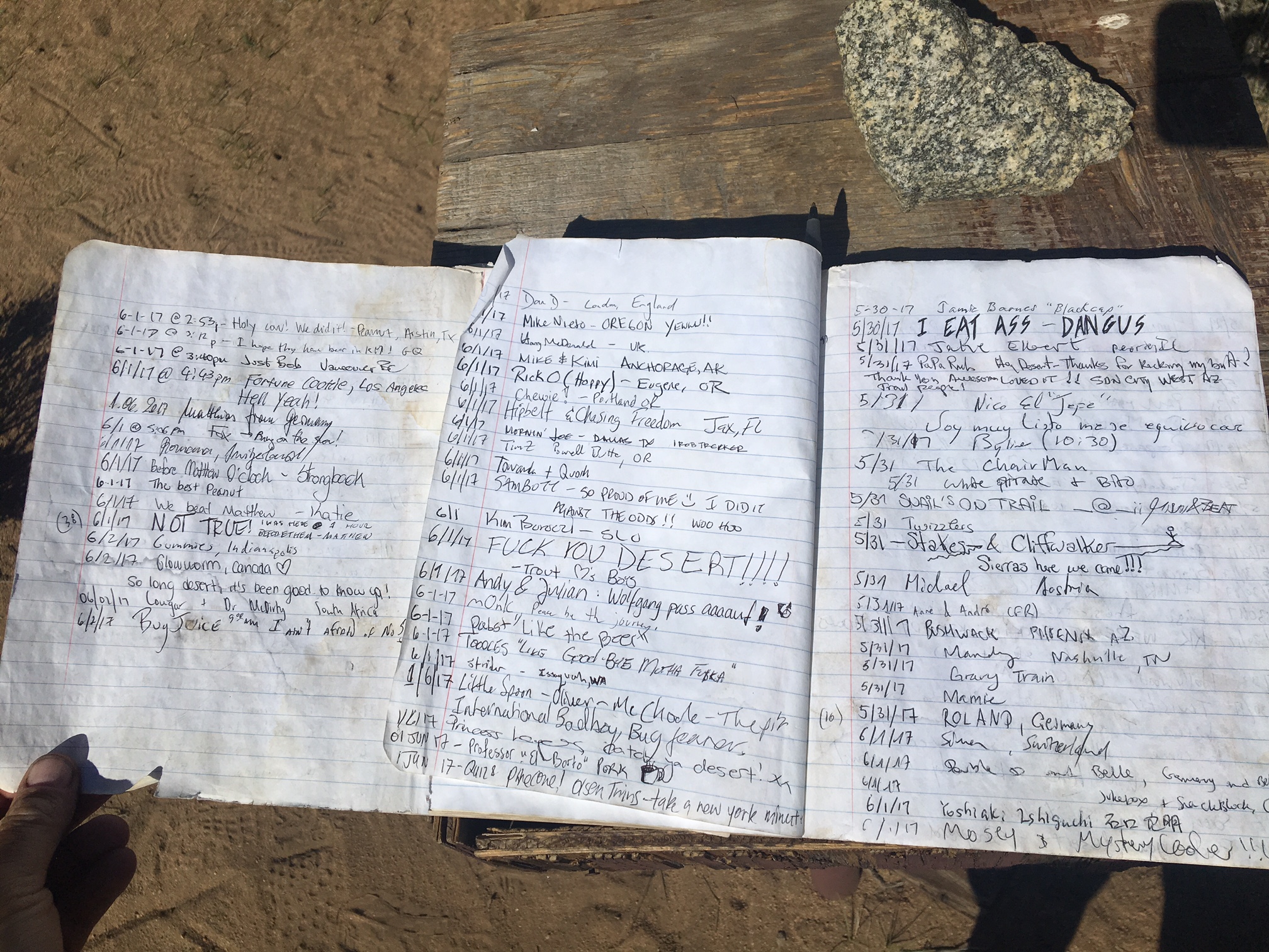 This is 2+ days worth of names who signed one of the random trail registers we come across at road crossings. There must be over 60 names (25/day?).