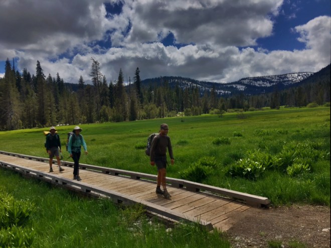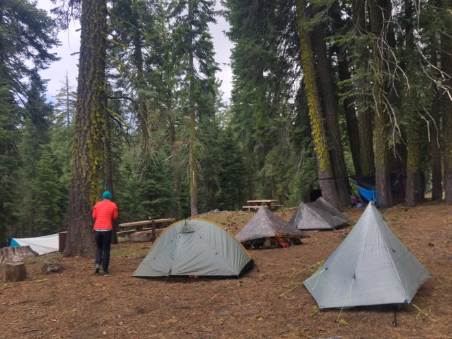 It’s raining a bit right now while inside my tent. Tomorrow it’s supposed to snow and there is quite a bit still on the ground at elevations over 6500′ which we’ll hit tomorrow. At least there aren’t dangerous stream crossings to contend with 🙂