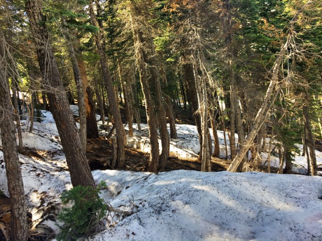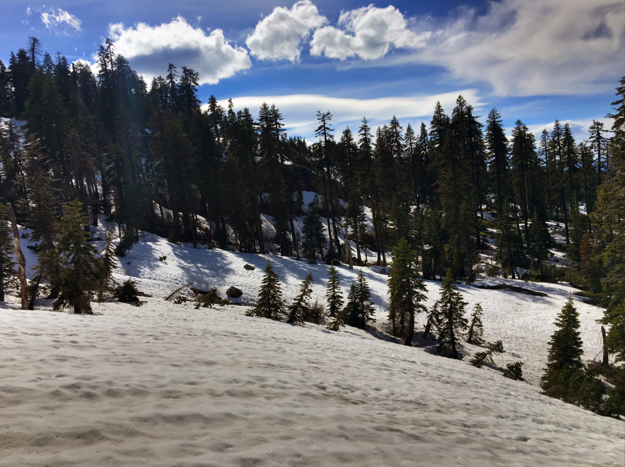 Just as I thought we were cruising into a stress free 27mile day the snow returned (snow line is ~5500′ here). Slipping, slidin, navigating, and progress slowed to a crawl.