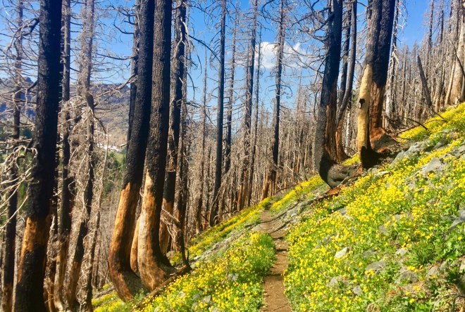 Today was about as easy a 27 mile day as you can do. The trail dropped 4000′ in elevation very gradually while following a creek.It did start to heat up as we approached the lower elevations (~1500′). The last 6 miles were a road walk with the last 4 on pavement…this feels quite terrible on the feet and knees but it makes for quick miles.