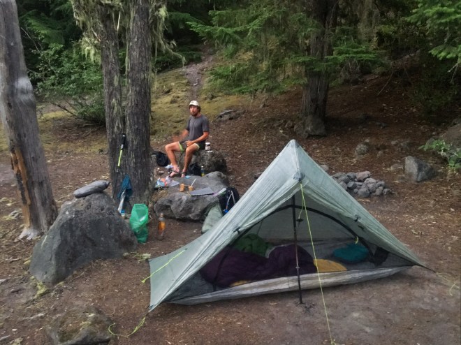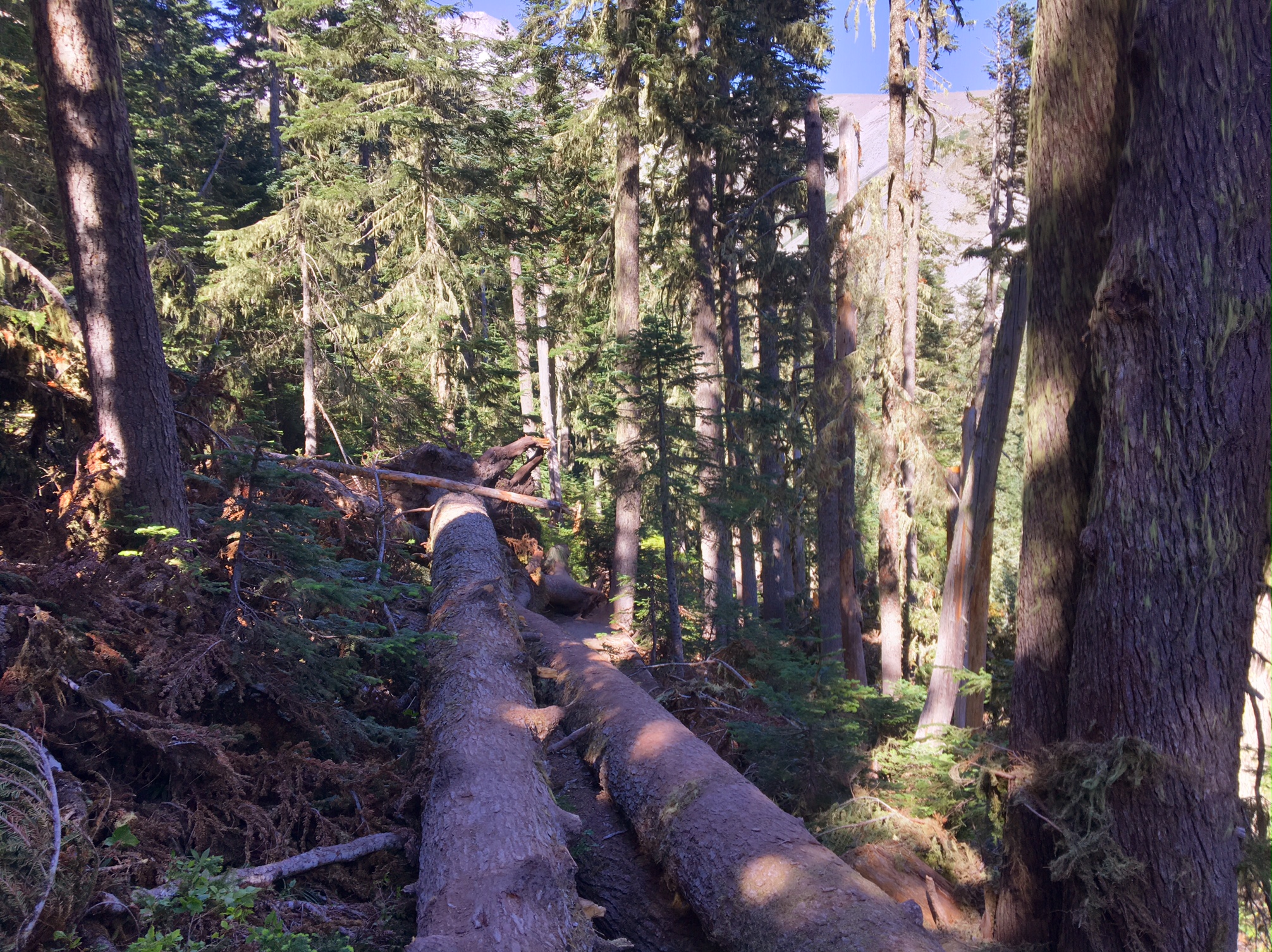 After a 4+hour siesta there were 10 more miles of hiking. Most of it was pretty easy until we got to an area of giant blow-downs. These logs are about 4′ in diameter and could Bering the trail length-wise.