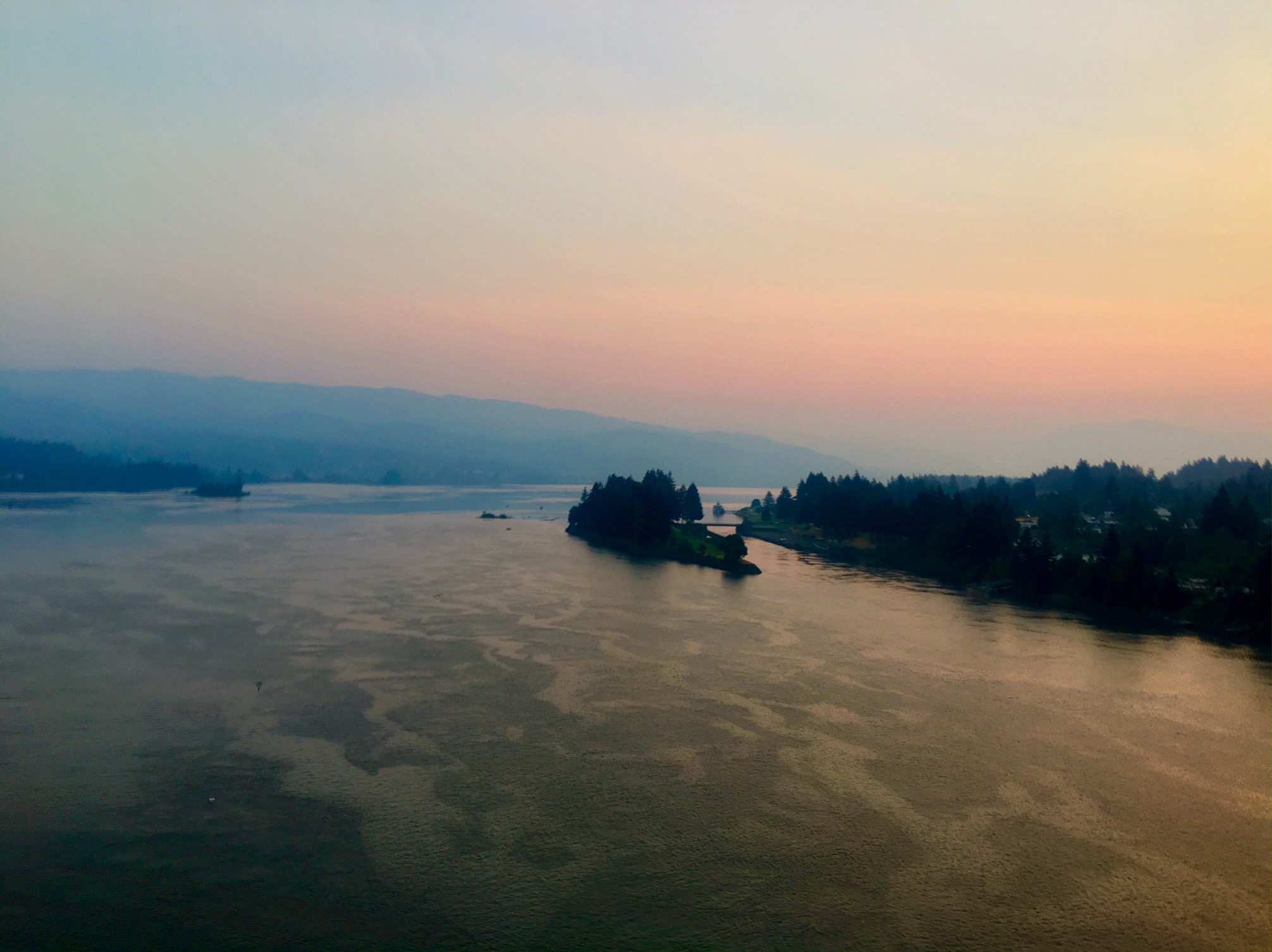 Approaching the Bridge of the Gods at 6am. Notice the large PCT sign lit up on light post.
