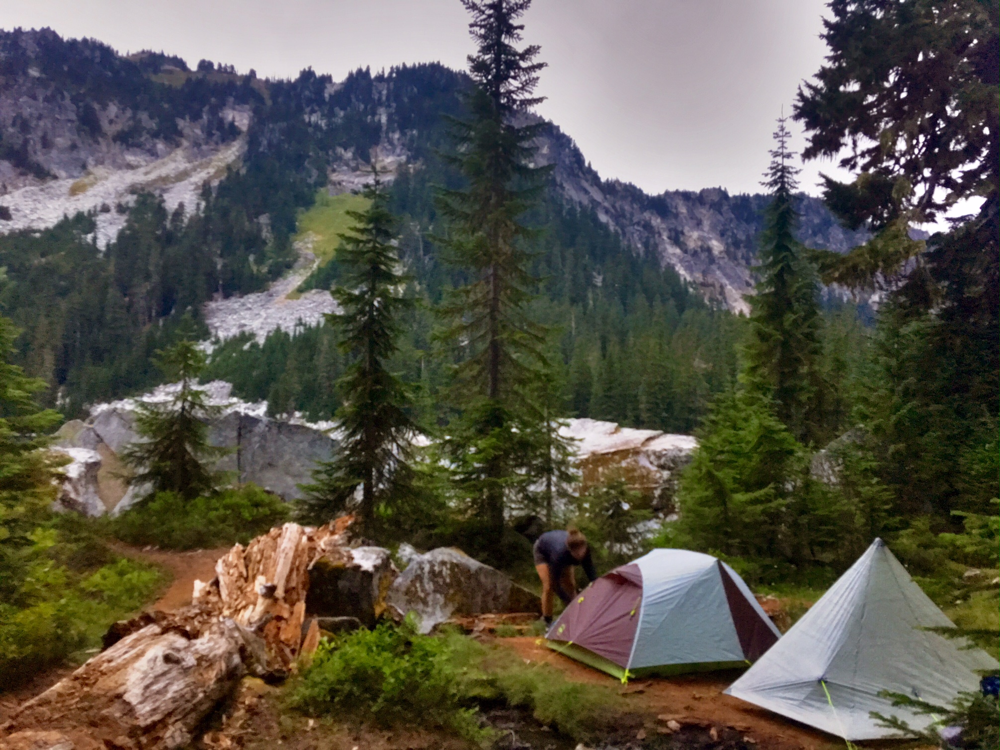 We rolled into camp at 7:45 on the shores of Glacier Lake. Flat campsites were at a premium but we managed to squeeze in.