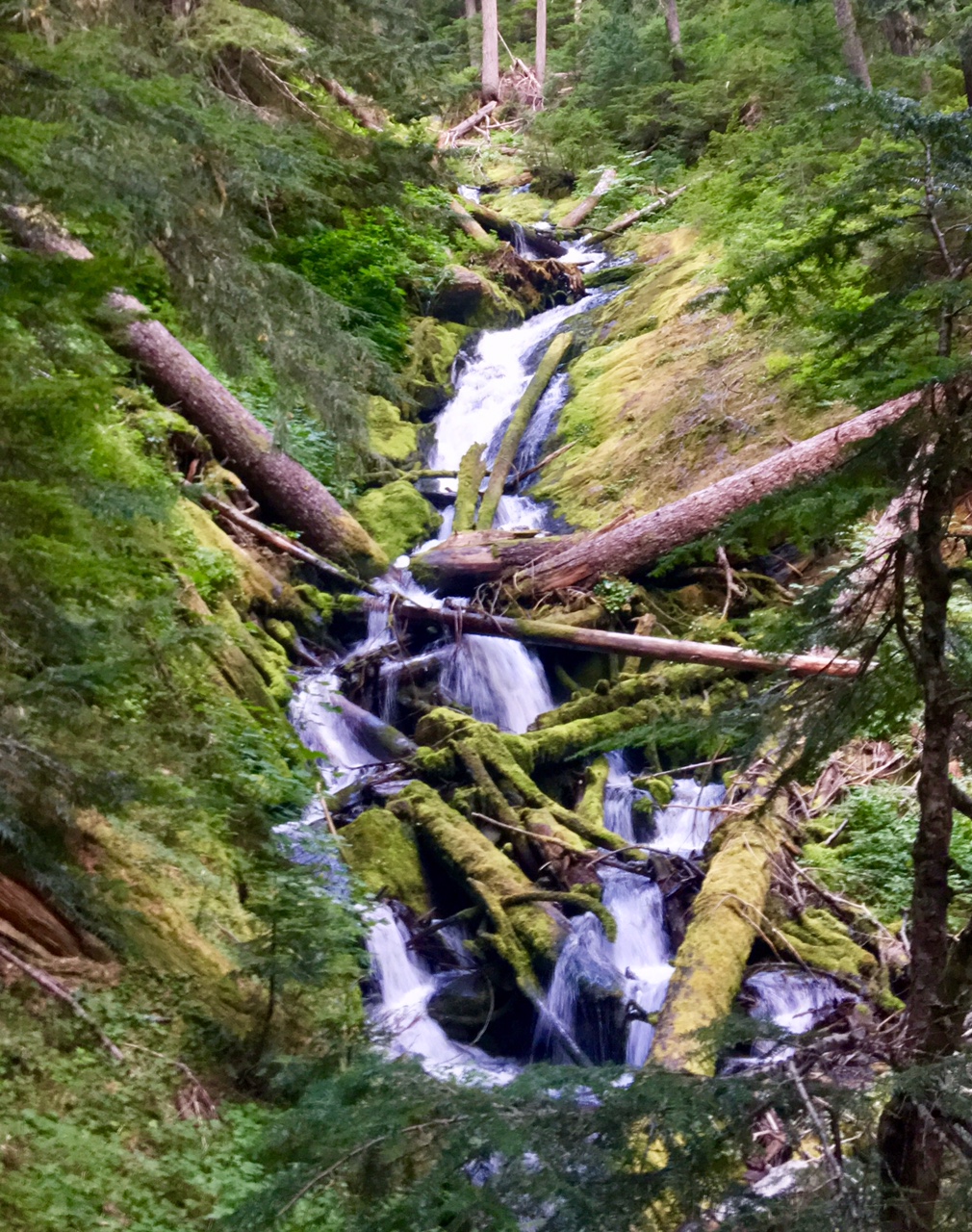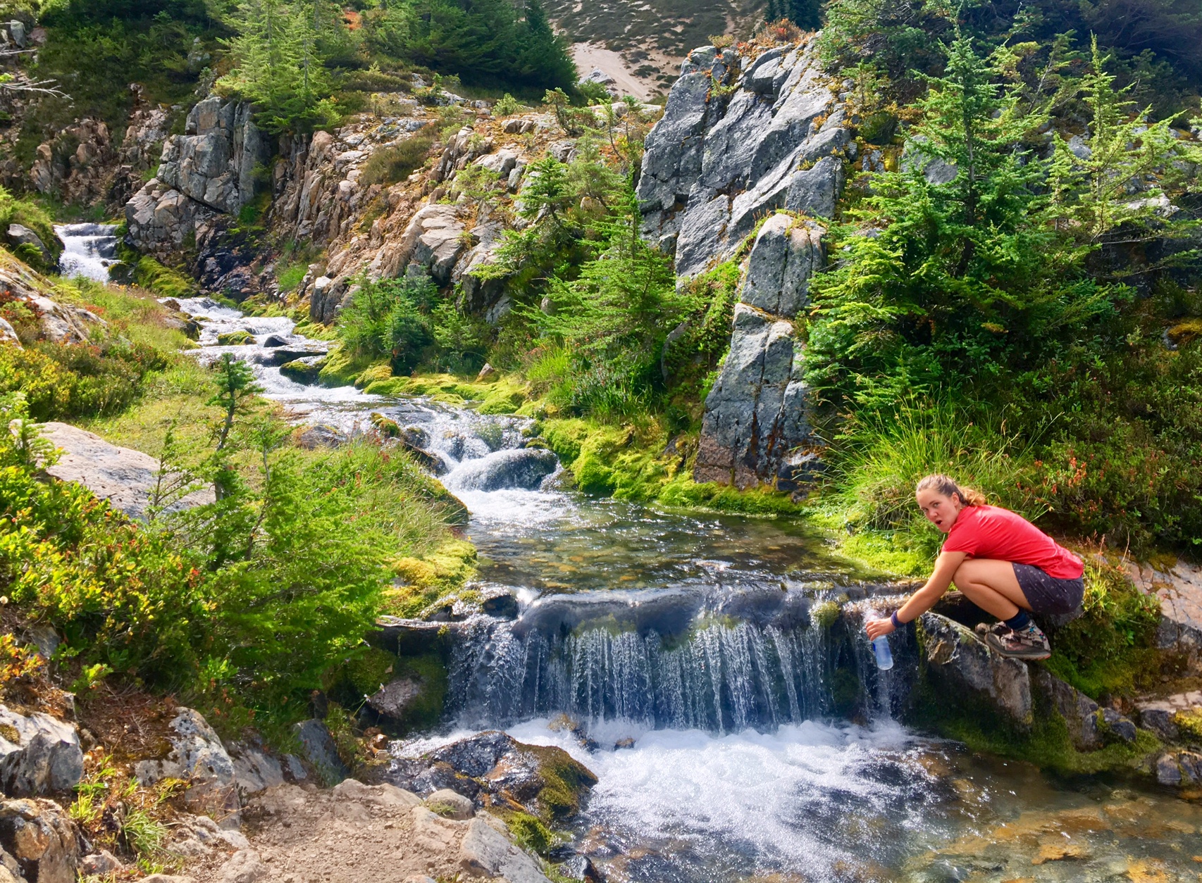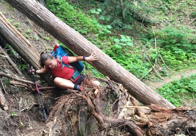 We woke up in the clouds this morning and no views of the giant peaks surrounding us. It was damp but not raining and temps in the 40’s. There was a lot of climbing (and just as much descending), over 9000′ by the time the day was done. Many of these were 300O’ at a time.