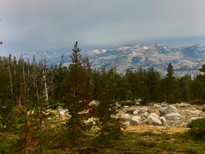 Most of the afternoon was dodging thunderstorms. The umbrella performed admirably. Mostly just my feet and legs were wet from all the wet brush. Lots of Sierra granite can be seen in the background here.